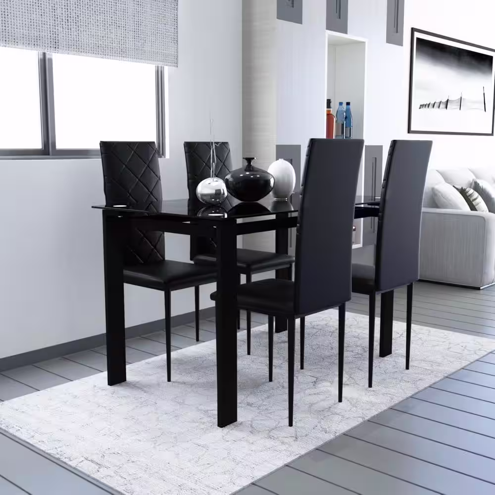 None 5-Piece Rectangle Glass Top Black Metal Frame Rhombic Leather Dinning Chair and Table Set