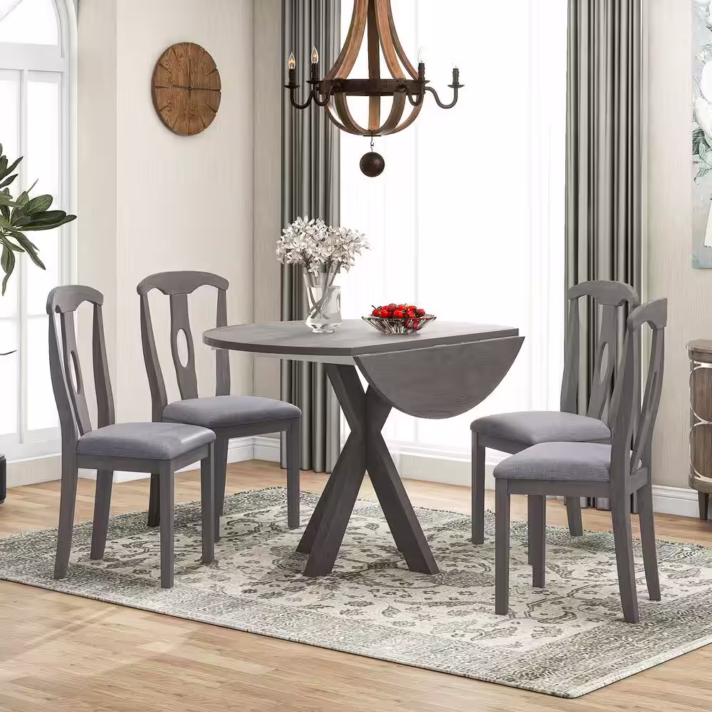 Harper & Bright Designs Rustic Farmhouse 5-Piece Gray Round Drop Leaf Wood Dining Table Set with 4-Padded Dining Chairs