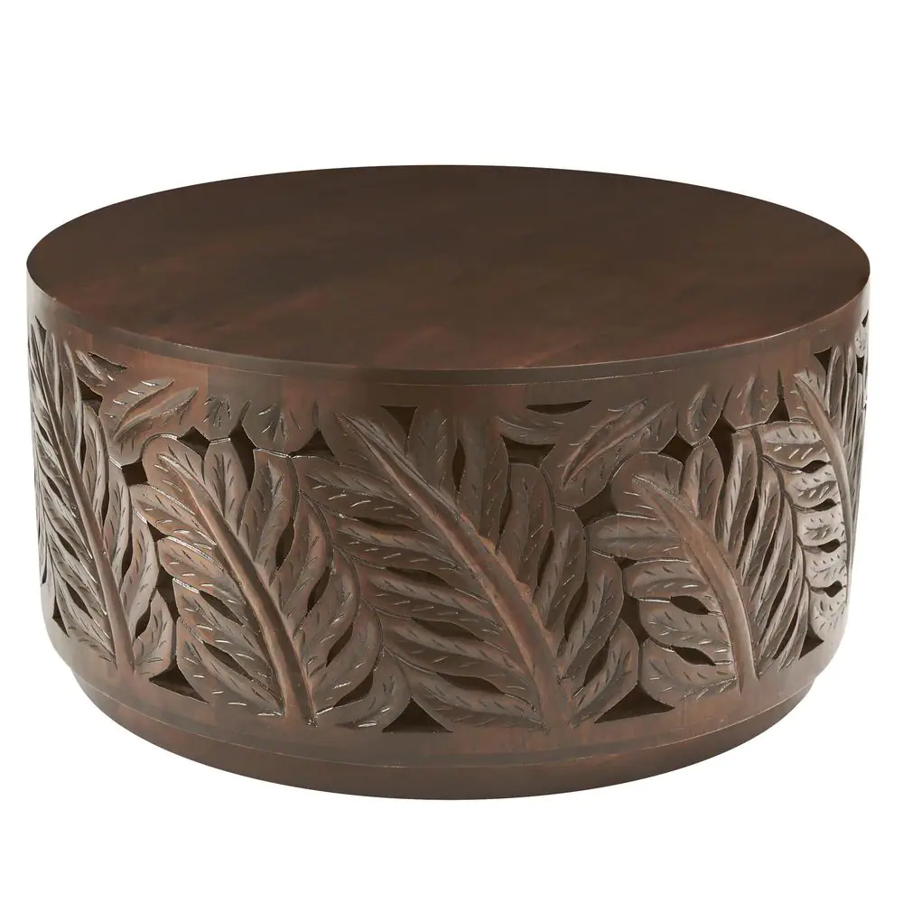 Home Decorators Collection Palmeadow 36 in. Round Carved Walnut Brown Wood Coffee Table