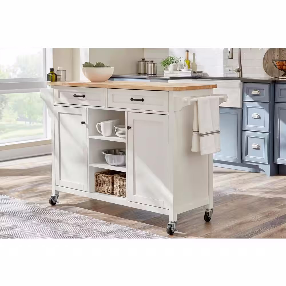 Home Decorators Collection Rockford White Rolling Kitchen Cart with Butcher Block Top and Double-Drawer Storage (56" W)