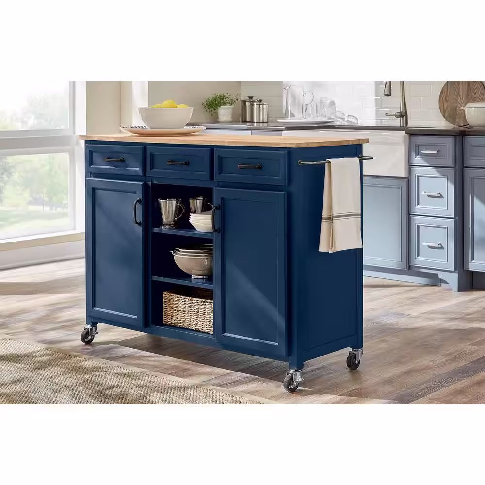 Home Decorators Collection Midnight Blue Rolling Kitchen Cart with Butcher Block Top and Storage (48" W)