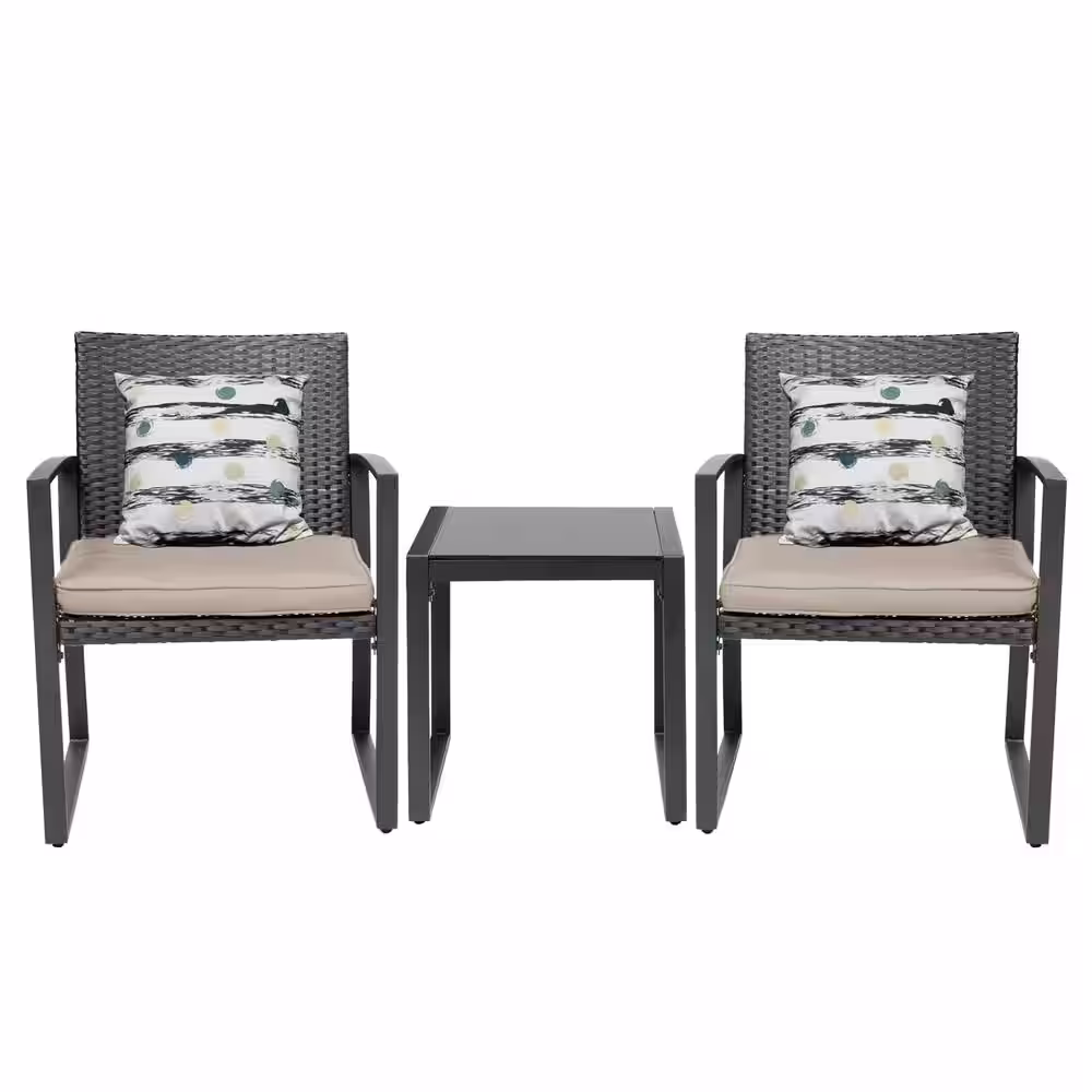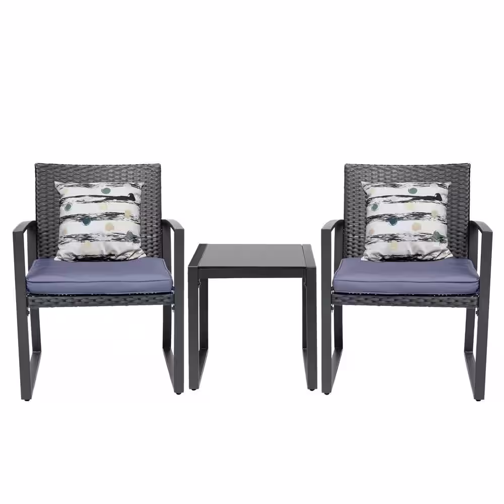 Pyramid Home Decor Lunar Outdoor 3-Piece Bistro Set Black Wicker Furniture-2 Chairs with Glass Coffee Table-Gray