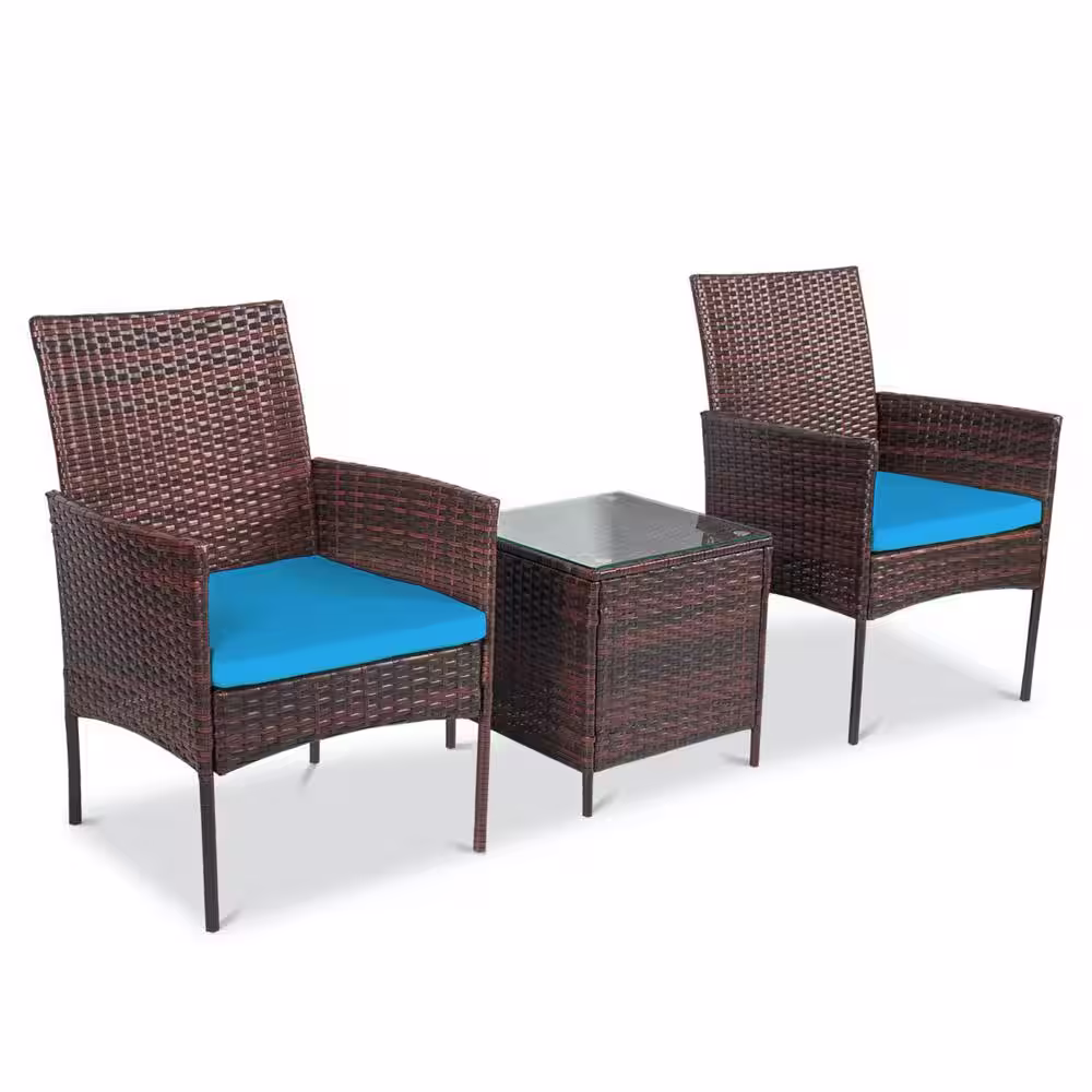 Pyramid Home Decor Alvino 3-Piece Wicker Rattan Outdoor Patio Bistro Set, Chairs with Thick Light Blue Cushion and Glass Top Coffee Table