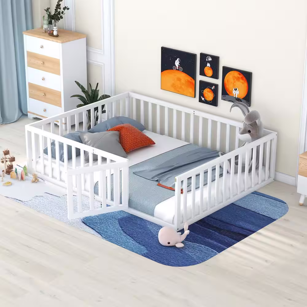 None Queen Size Wood Daybed Frame with Fence, Queen Floor Bed with Door for Toddlers Kids, Box Spring Needed, White
