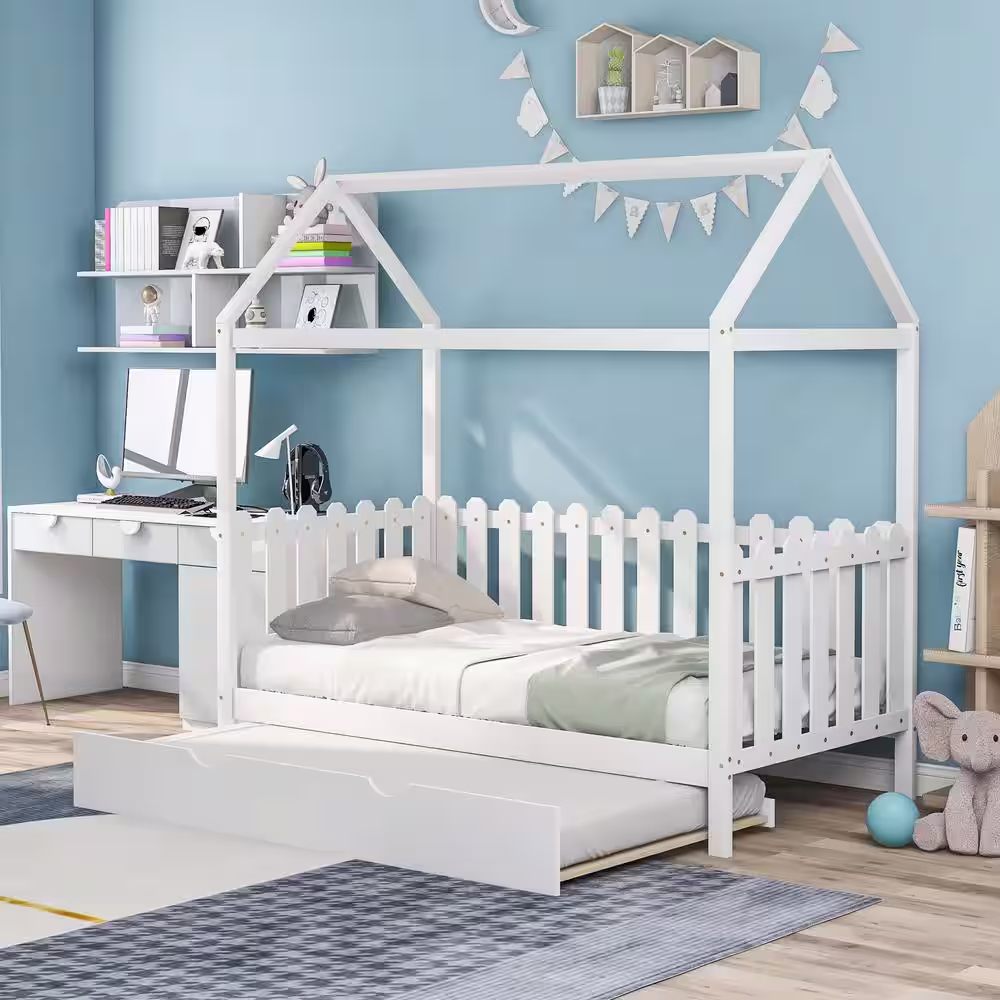 Harper & Bright Designs White Twin Size Wood House Bed with Trundle and Fence-Shaped Guardrail