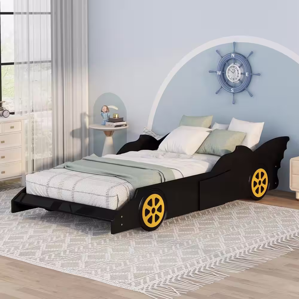 Harper & Bright Designs Black Wood Frame Twin Size Race Car-Shaped Platform Bed with Yellow Wheels