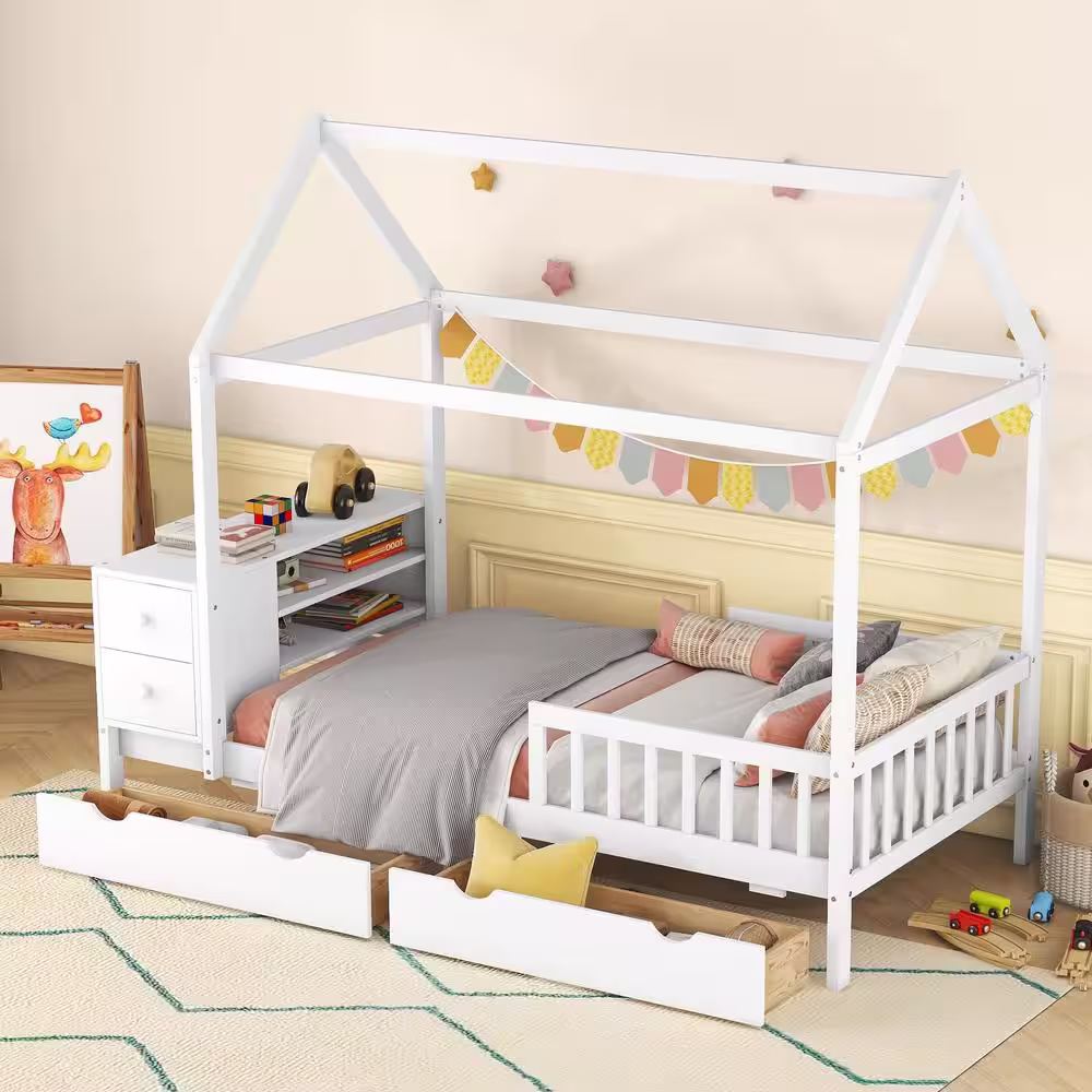 Harper & Bright Designs White Twin Size Wood House Bed with Fence, 4 Drawers, Shelves and Desk