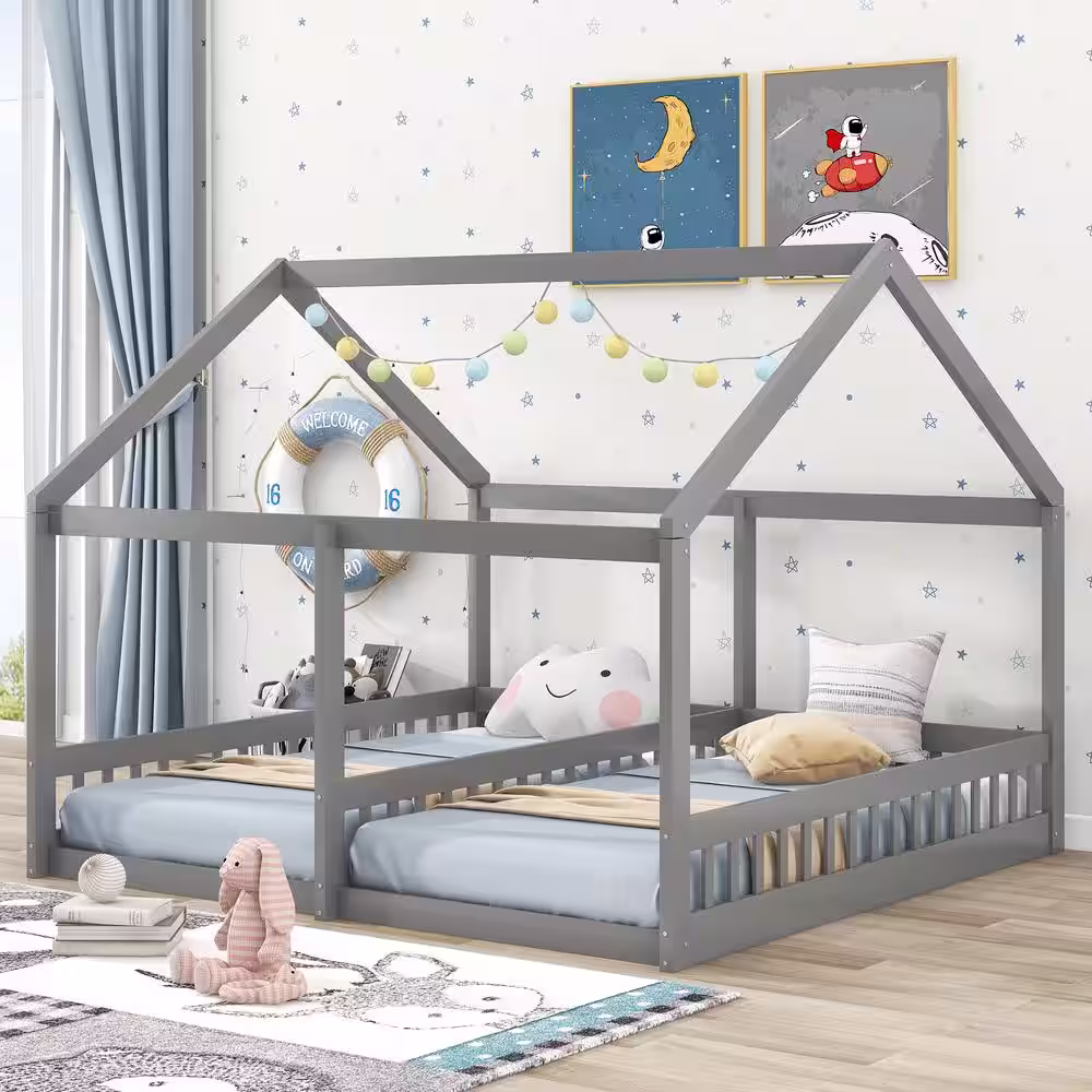 Harper & Bright Designs Gray Twin Size Wooden House Platform Beds with 2 Shared Beds