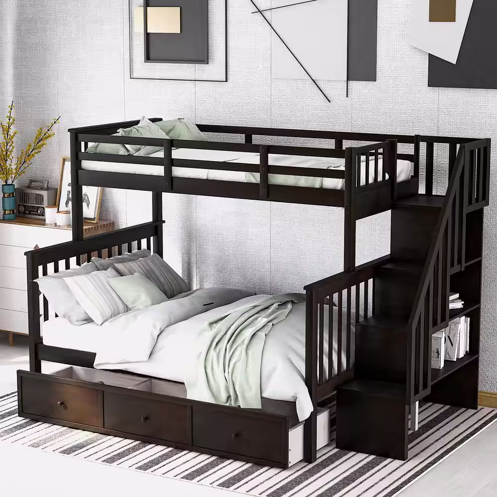 Qualler Espresso Stairway Twin Over Full Bunk Bed with Drawer and Storage