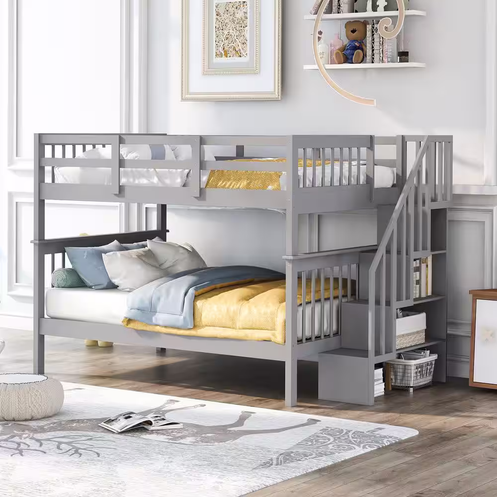 Qualler Gray Stairway Full-over-Full Size Bunk Bed with Storage and Guardrail