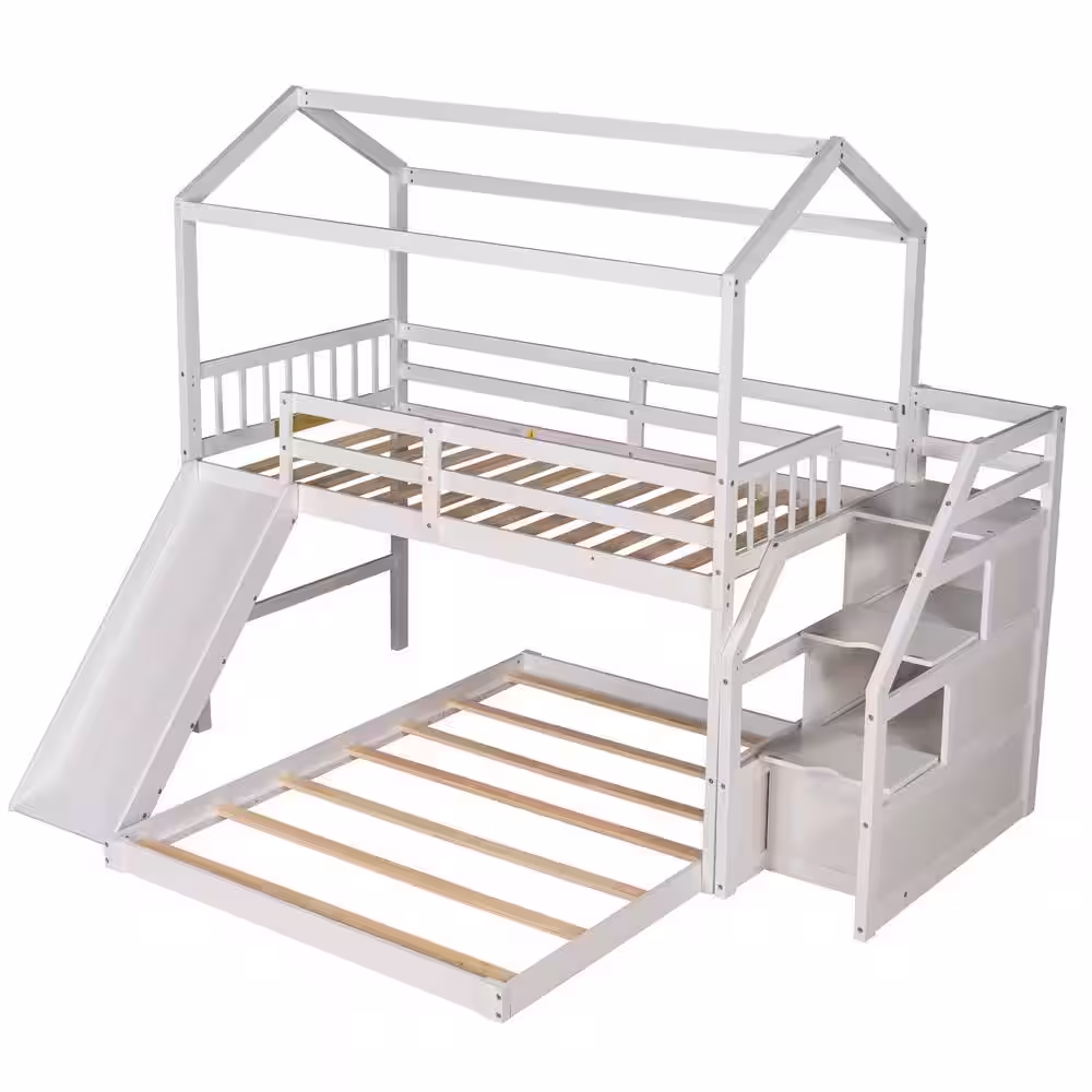 GOJANE White Twin over Full House Bunk Bed with Convertible Slide and Storage Staircase, Full-Length Guardrail