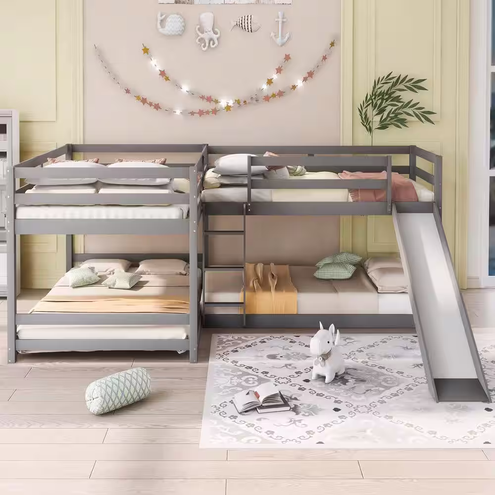 ANBAZAR Gray L-shaped Full and Twin Size Bunk Beds with Slide and Ladder, Double Wood Bunk Beds for 4 Kids and Teens