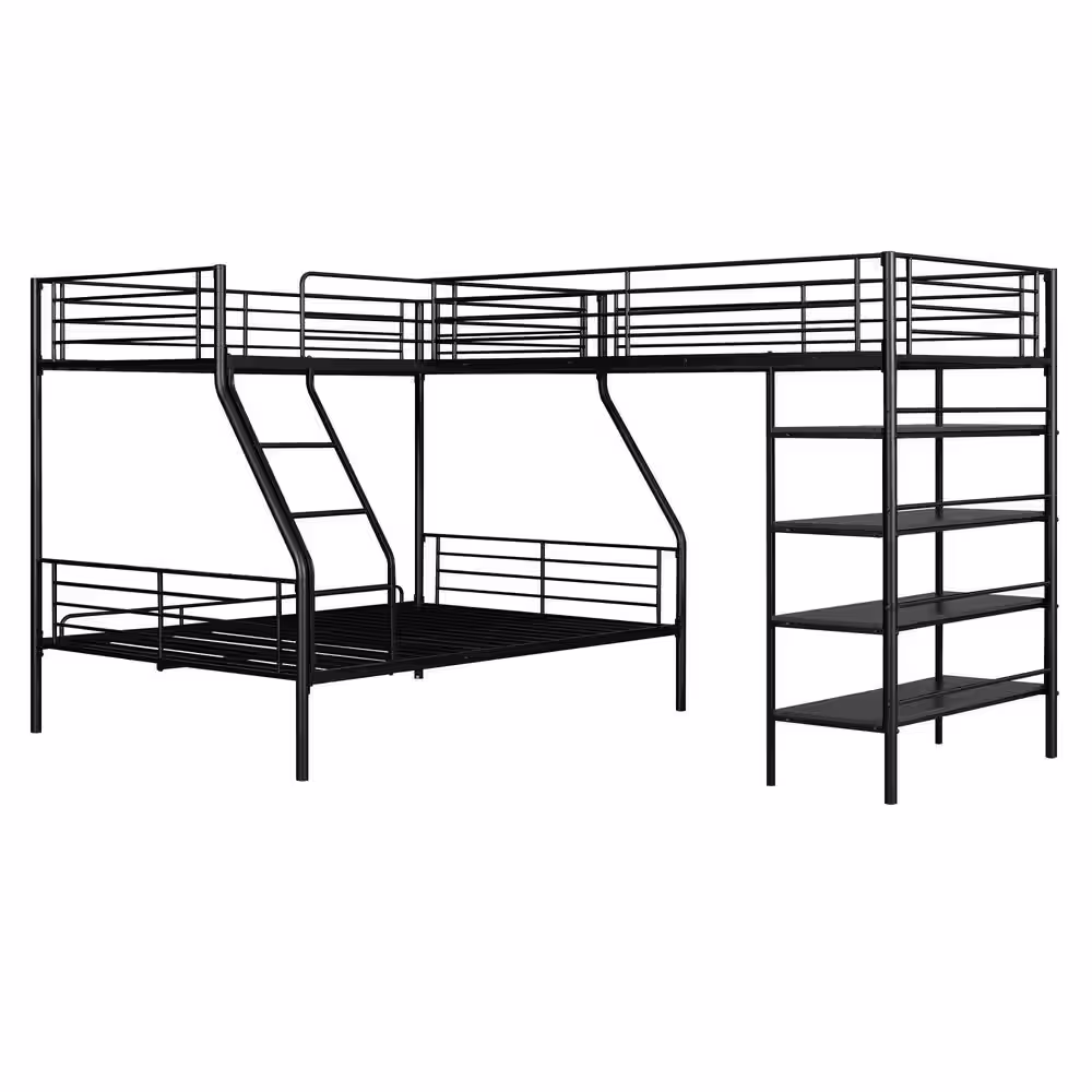 Harper & Bright Designs L-shaped Black Twin and Twin over Full Metal Triple Bunk Bed with 4 Built-in Shelves