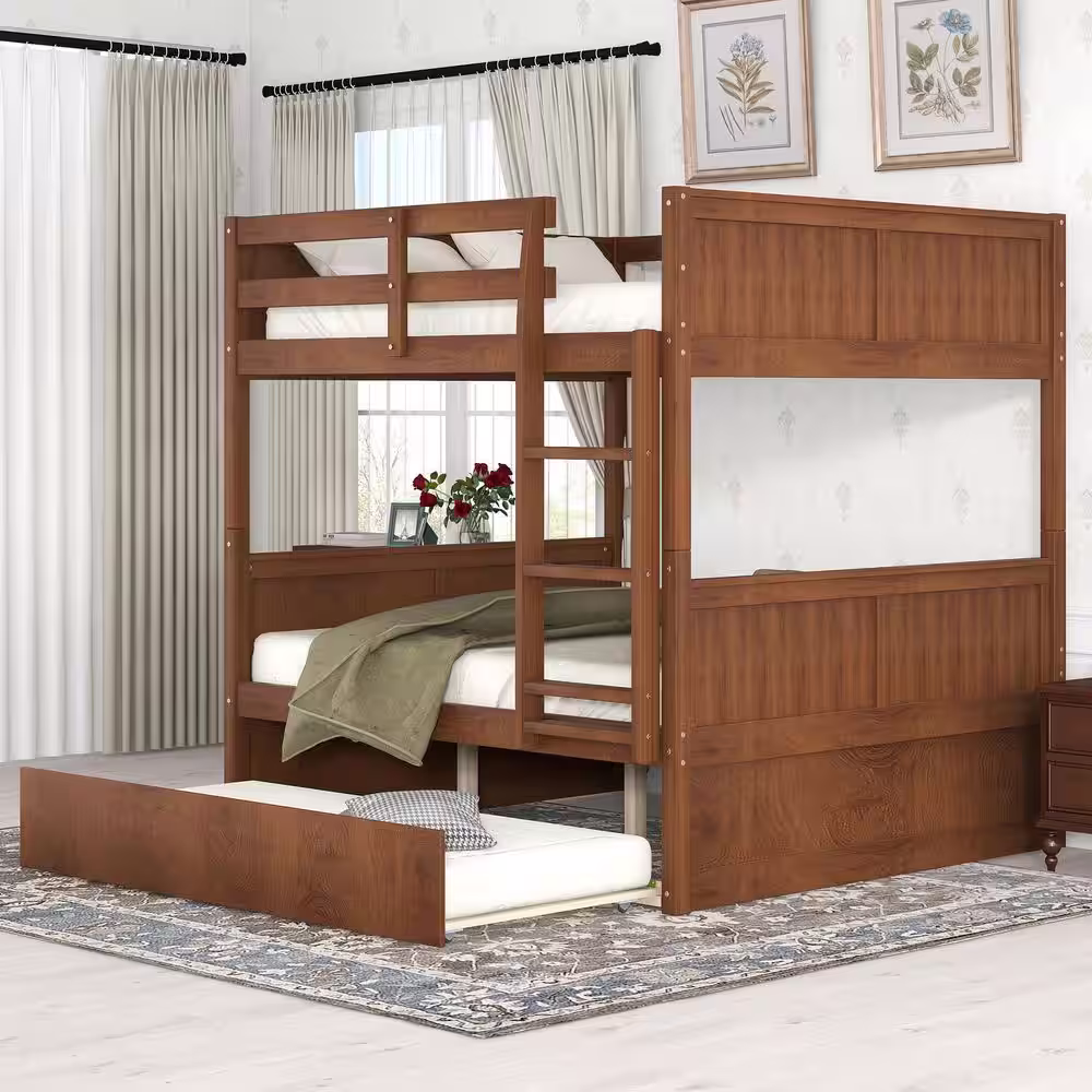 None Walnut Full Over Full Bunk Bed for Kids Teens, Detachable Wood Full Bunk Bed Frame with Twin Size Trundle