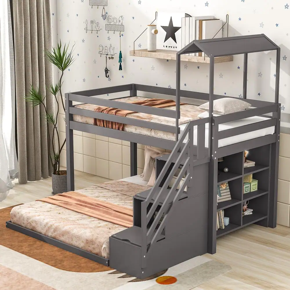 Harper & Bright Designs Gray Twin over Full House Roof Bunk Bed with Staircase and Shelves