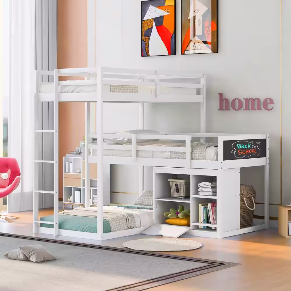 Harper & Bright Designs White L-Shaped Wood Triple Twin Size Bunk Bed with Blackboard, 4-Storage Cabinets and Ladder