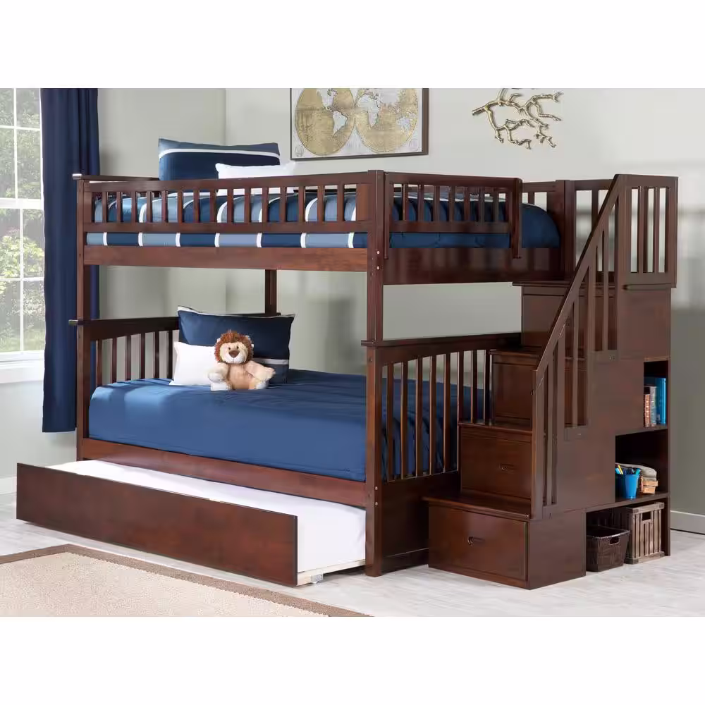 AFI Columbia Staircase Bunk Bed Full over Full with Full Size Urban Trundle Bed in Walnut