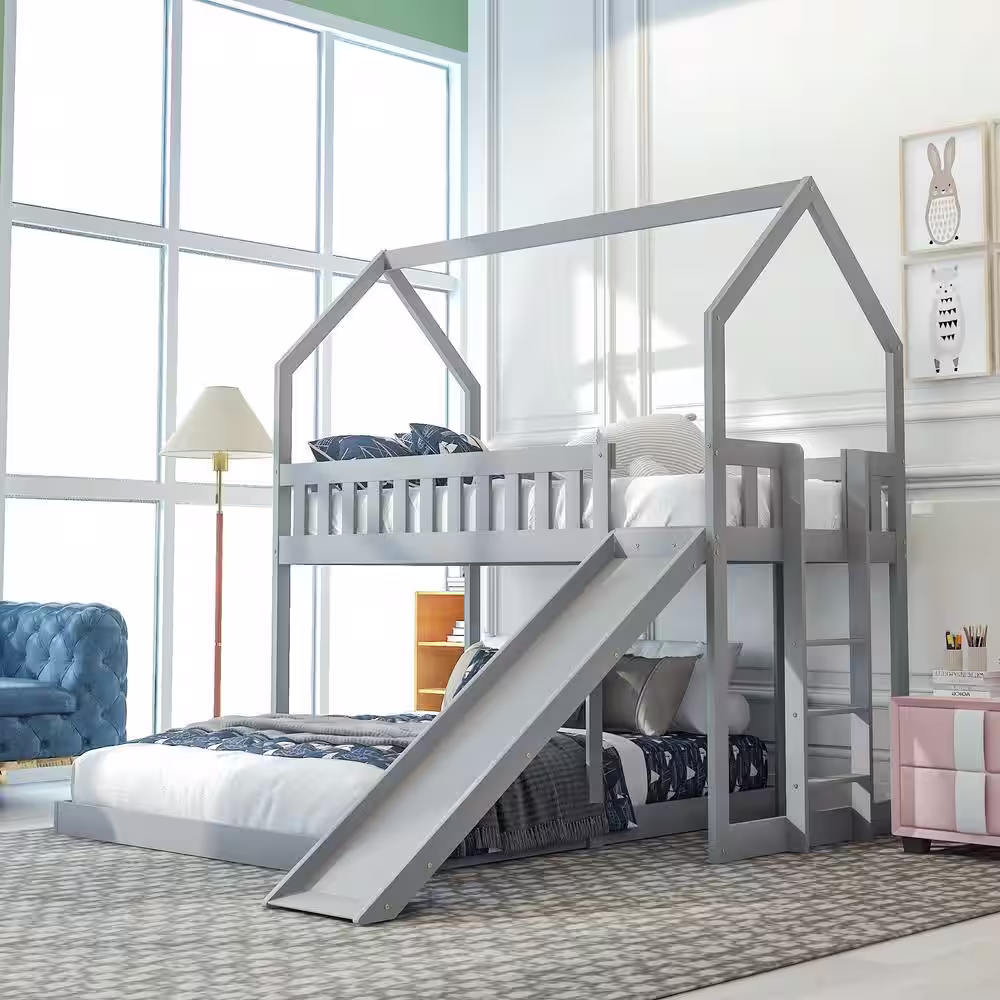 Harper & Bright Designs Gray Twin over Full Wood House Bunk Bed with Built-in Ladder and Slide