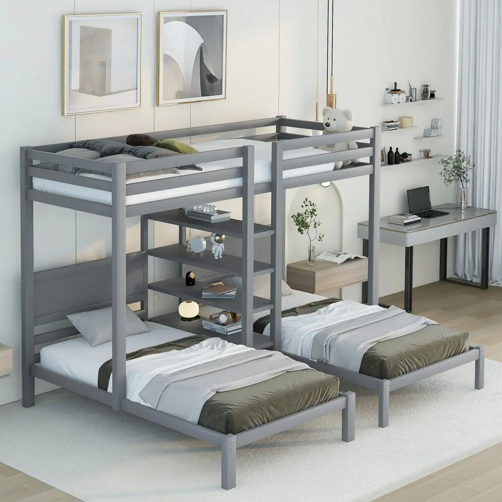 Harper & Bright Designs Gray Twin XL Over Twin and Twin Bunk Bed with Built-in 4 Shelves and Ladder