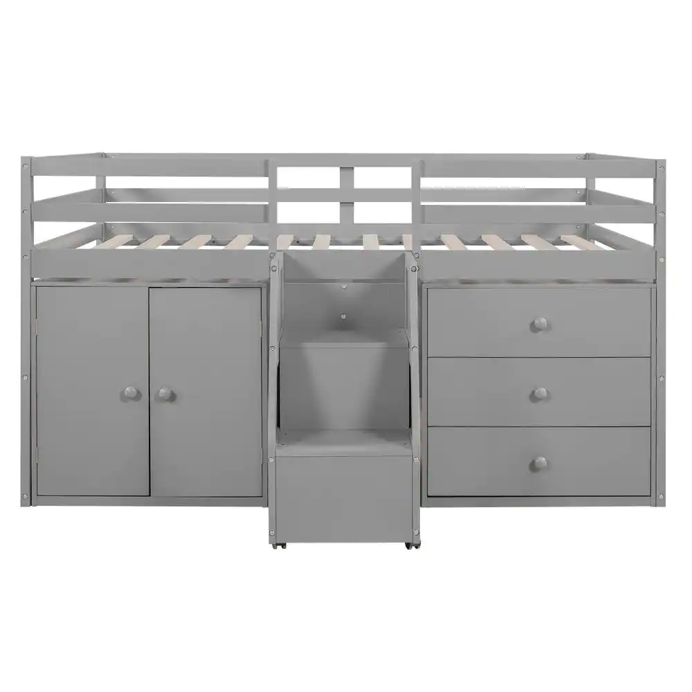 None Gray Wood Full Size Low Loft Bed with Cabinets and Drawers, Hanging Clothes At The Back Of The Staircase