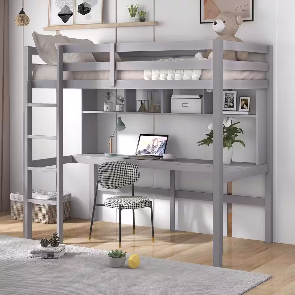 Qualler Gray Twin Size Loft Bed with Desk and Shelves