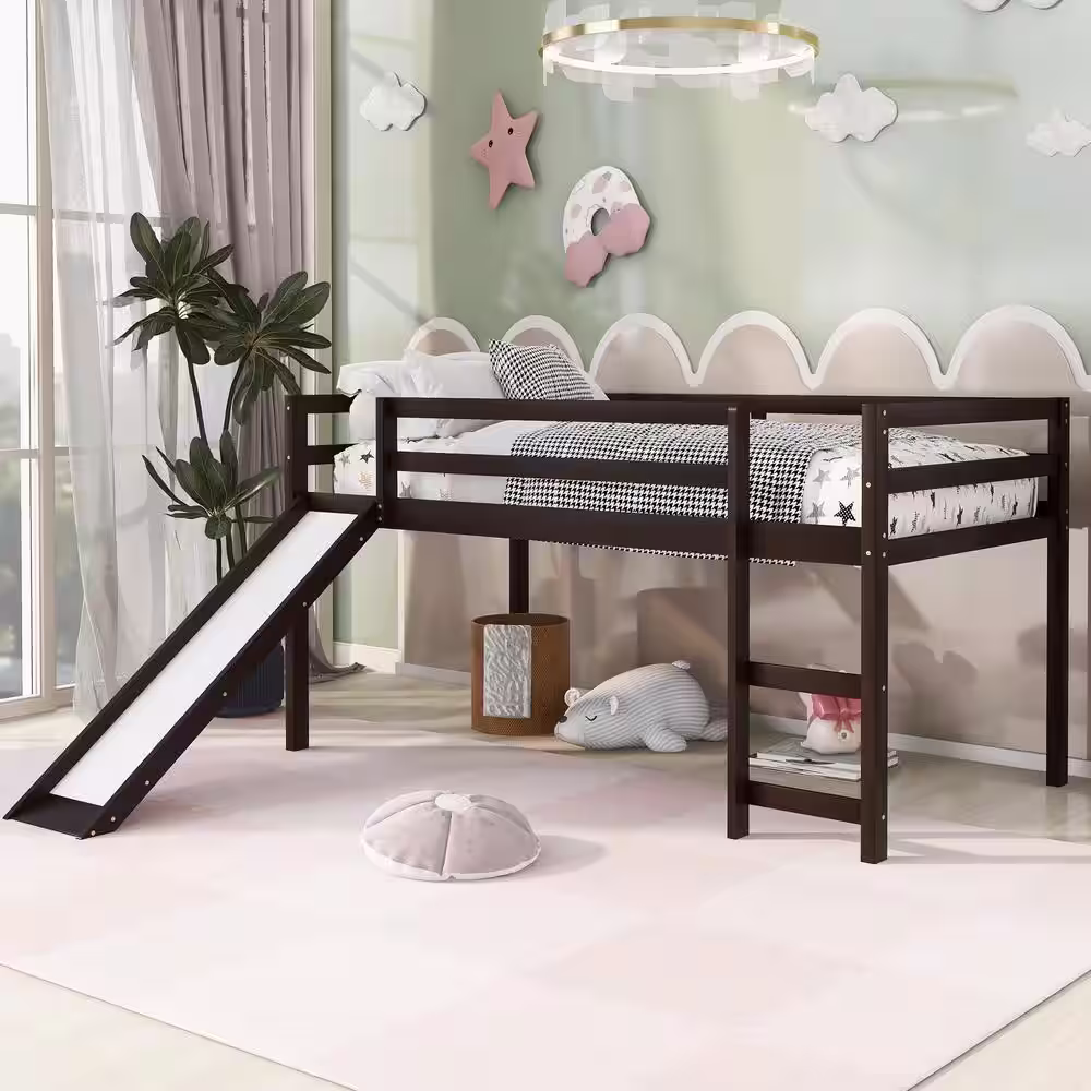 Harper & Bright Designs Espresso Twin Size Wood Loft Bed with Slide and Ladder