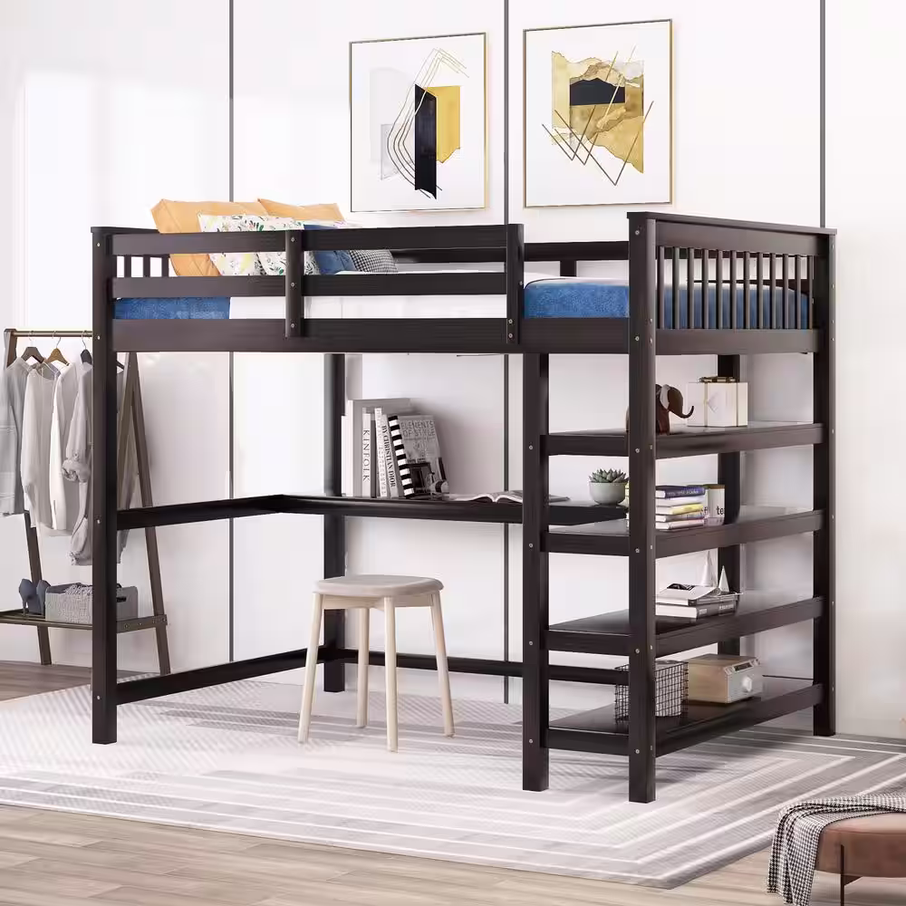 Qualler Espresso Full Size Loft Bed with Storage Shelves and Under-Bed Desk
