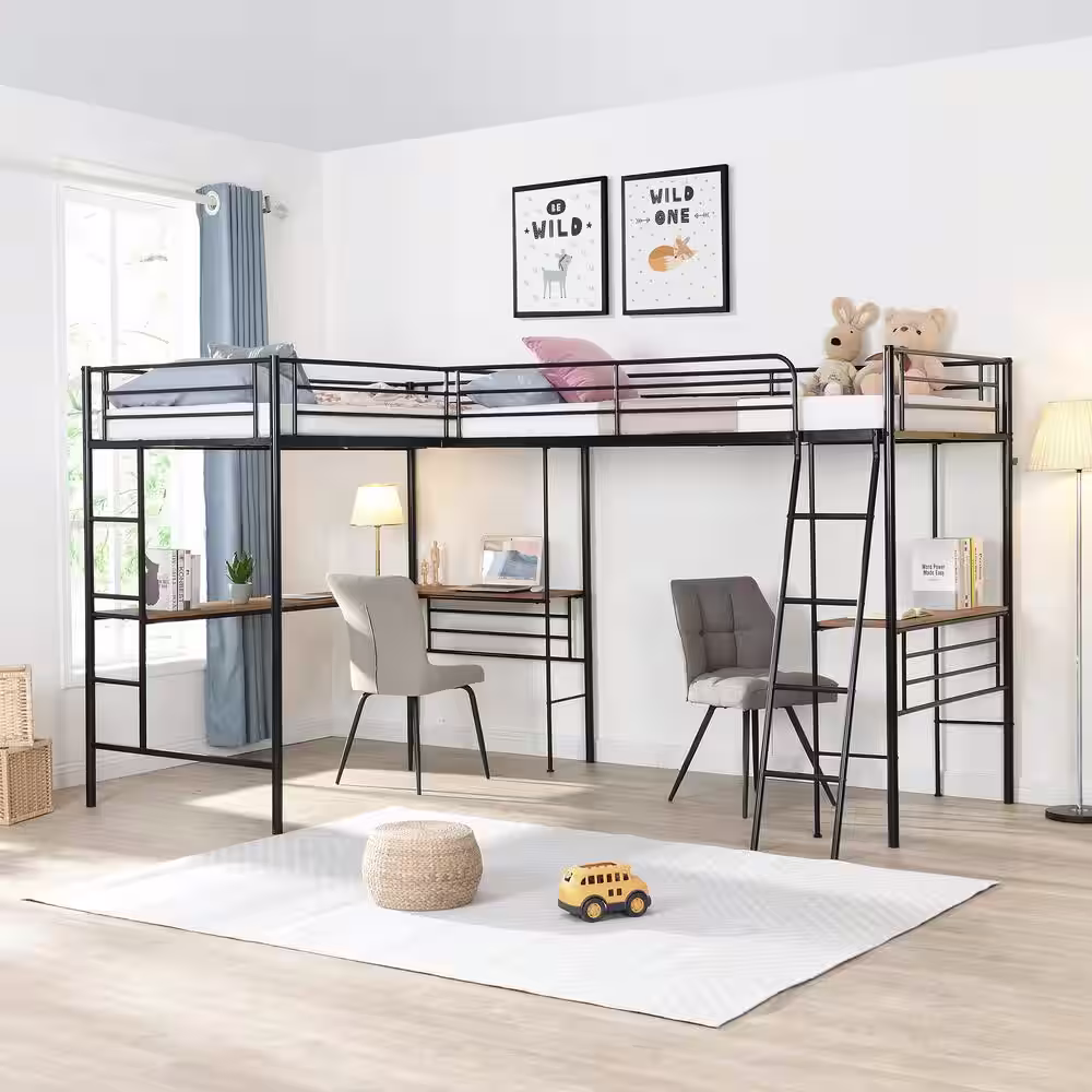 Harper & Bright Designs L-shaped Black Metal Twin Size Loft Bed with 2 Built-in Desks and 2 Ladders