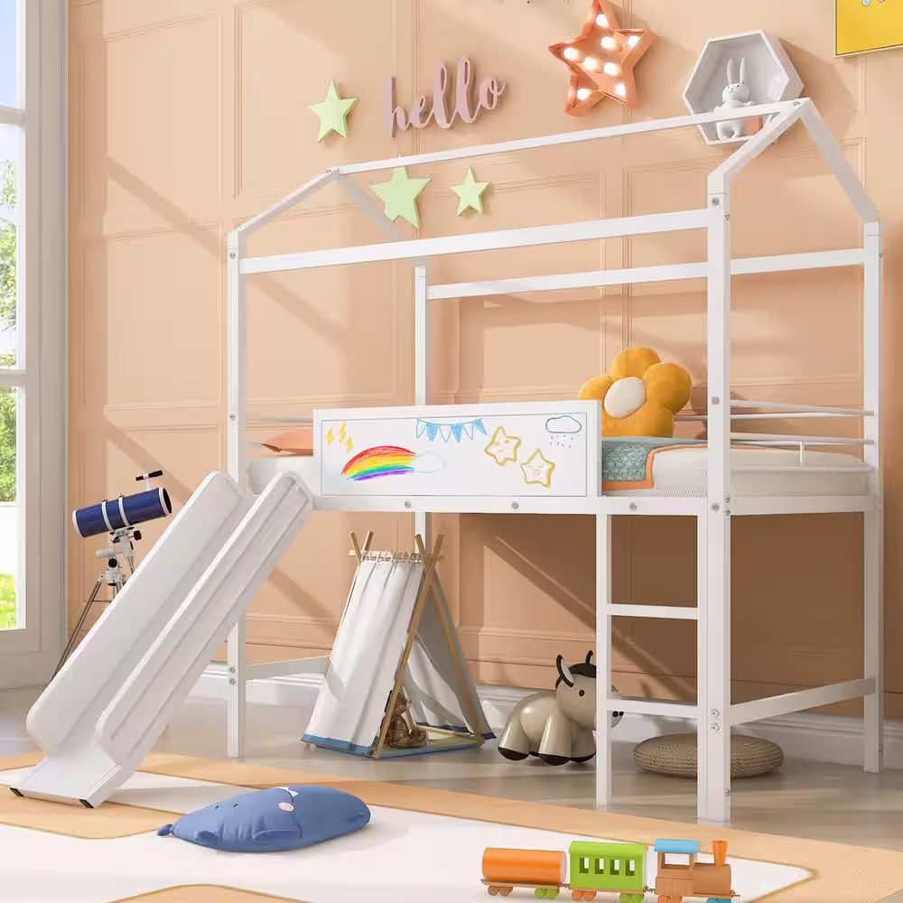Harper & Bright Designs White Twin Size Metal House Bed Loft Bed with 2-sided Writable Wooden Board, Slide, and Ladder