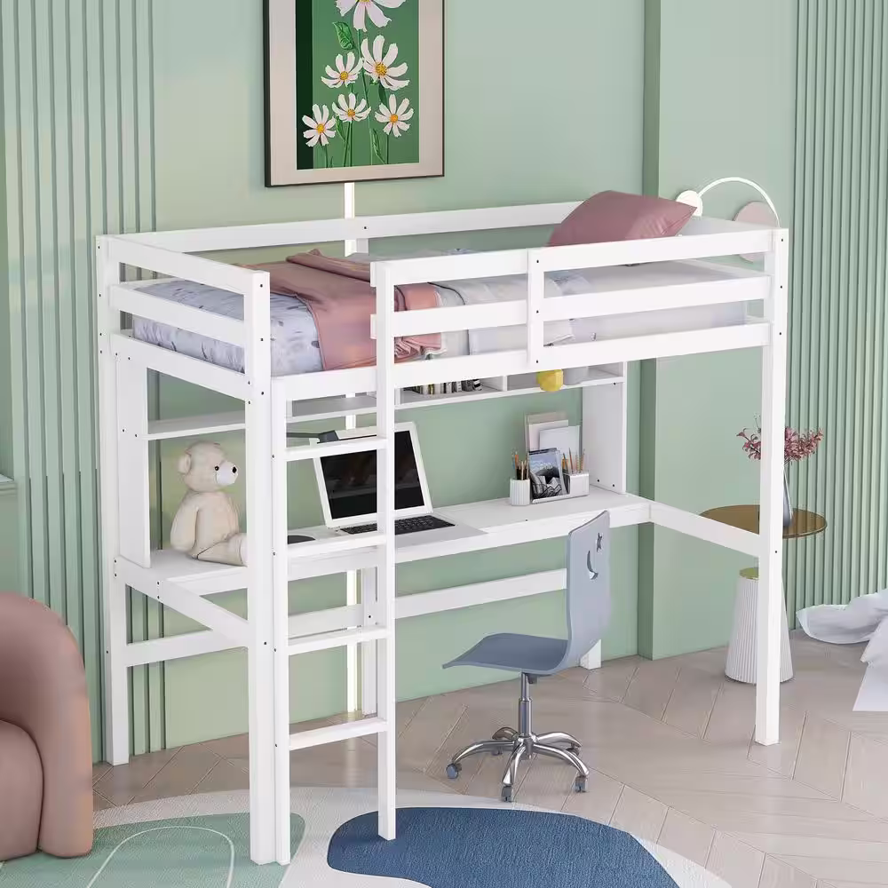 None White Twin Size Loft Bed with Desk, Wooden Loft Bed Frame with Shelves, Built in Ladder, Loft Bed for Kids Teens