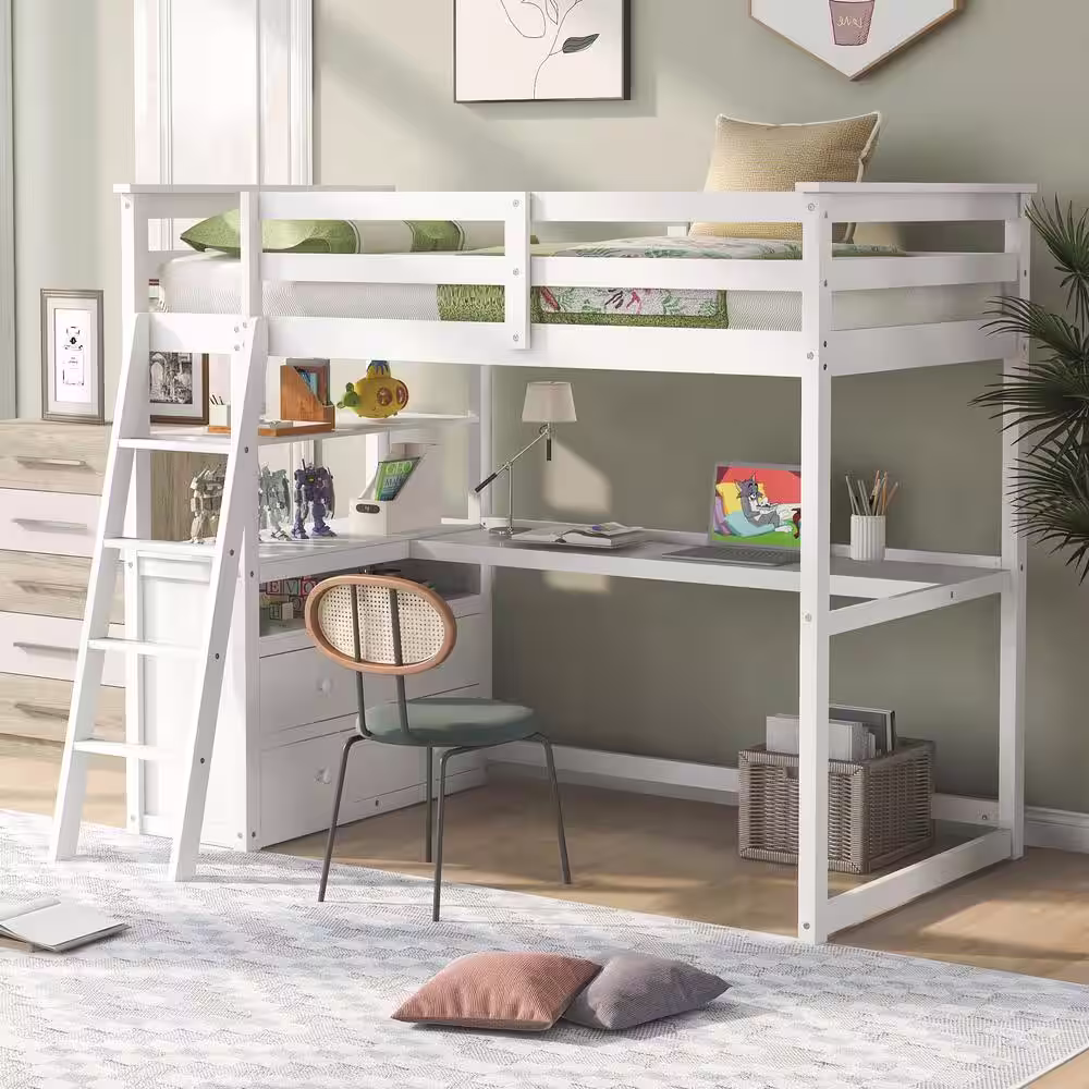 Harper & Bright Designs White Wood Frame Full Size Loft Bed with Built-in Desk and Ladder, Storage Shelves
