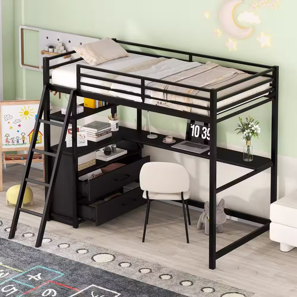 Harper & Bright Designs Black Metal Twin Size Loft Bed with Wood Desk and Shelves, 2 Built-in Drawers