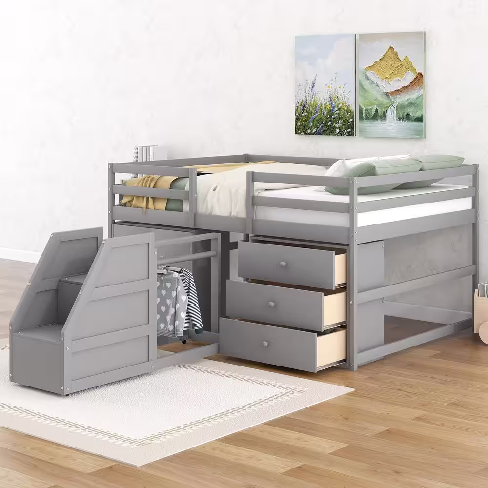 Harper & Bright Designs Gray Full Size Functional Loft Bed with Cabinets, Drawers and Staircase
