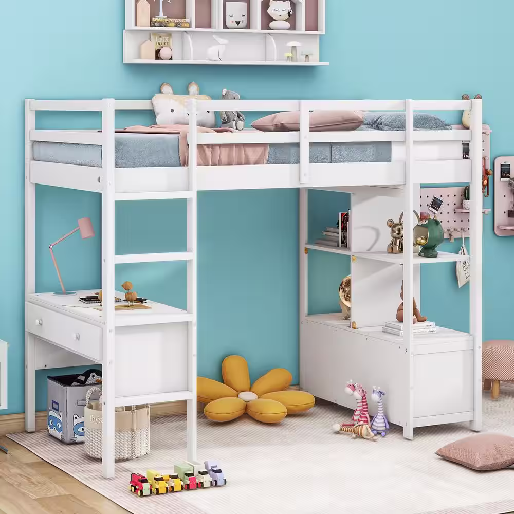None White Twin Size Loft Bed with Desk and Shelves, Wood Kids Loft Bed Frame with 2 Built-in Drawers