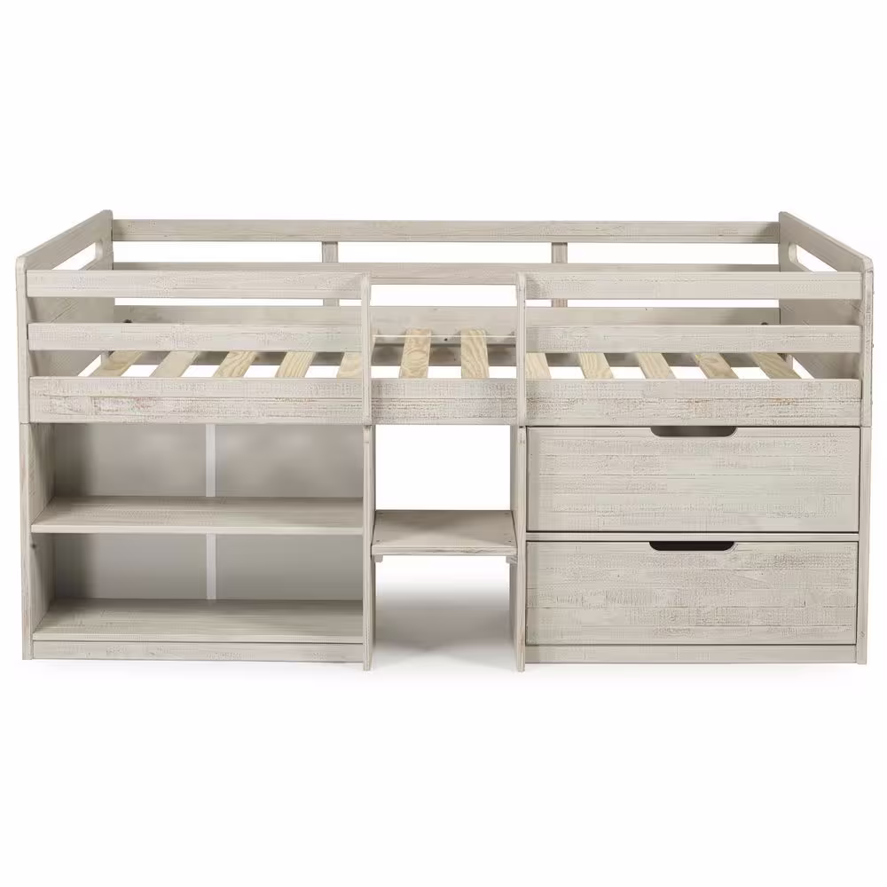 None White Twin Loft Bed with Staircase and Built-in Desk