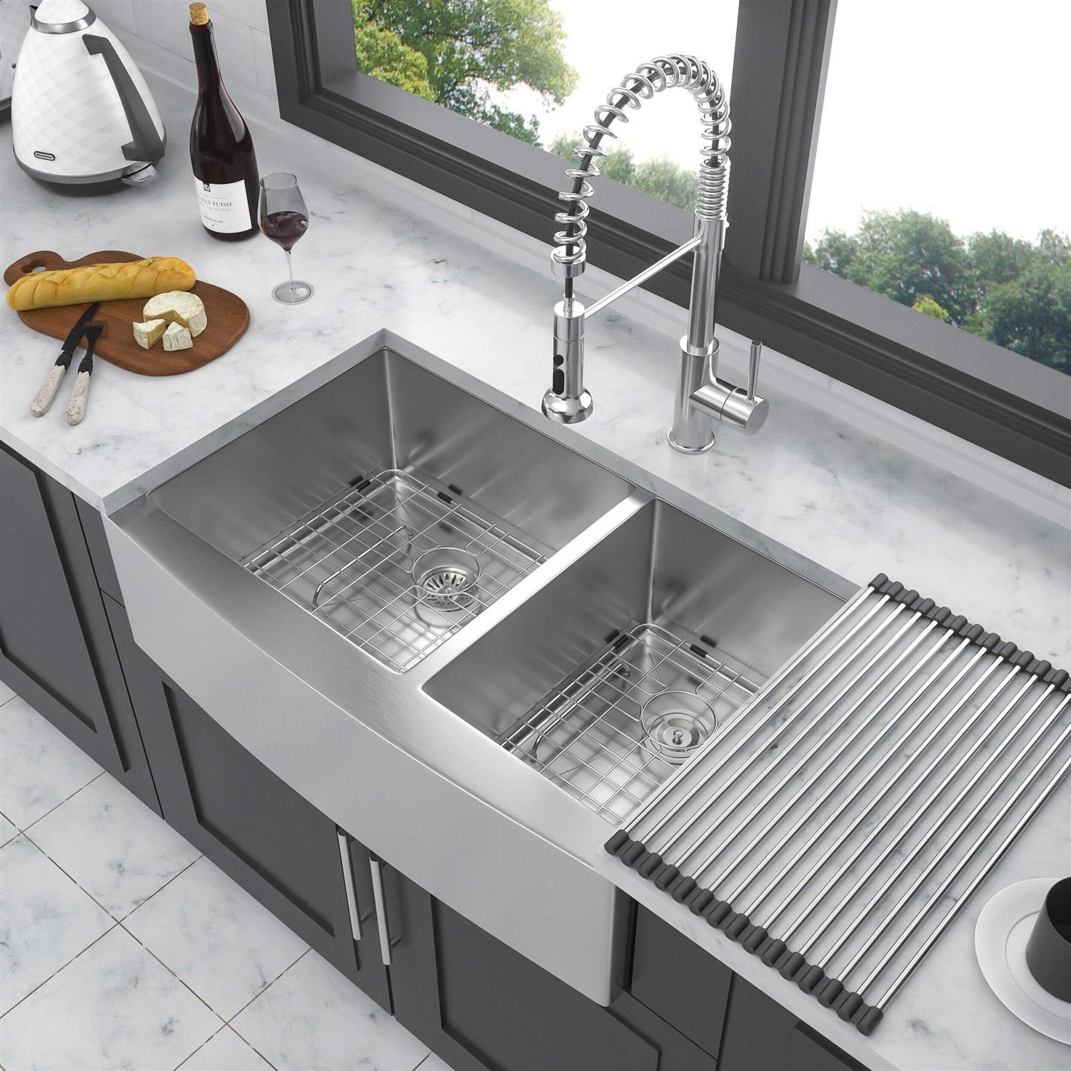stufurhome Lod 33 in. Farmhouse/Apron-Front Double Bowl Brushed Nickel Stainless Steel Kitchen Sink with Two 10 Deep Basin YBX-W1243122100