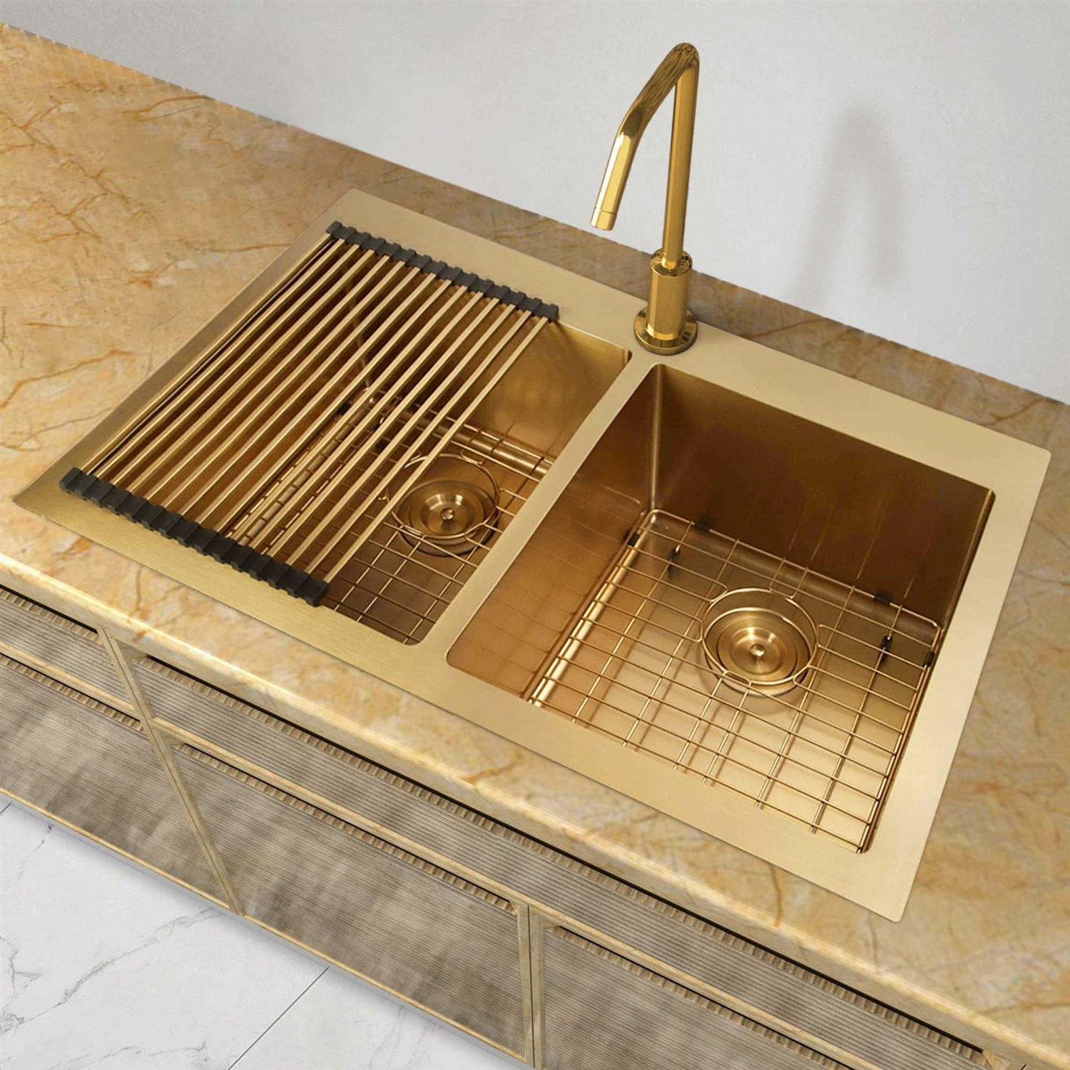 Zeesink Double Bowl Kitchen Sink,Drop in Kitchen Sink 33 X 22 inch,Gold Kitchen Sink,Top Mount Kitchen Sink,16 Gauge Stainless Steel Kitchen Sinks
