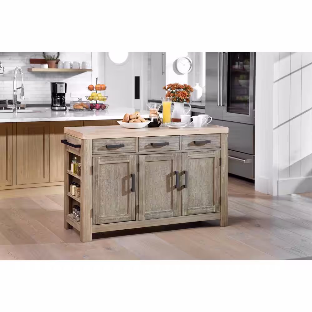 None White Rubber Wood Desktop 53 in. W Kitchen Island on 5-Wheels with Storage Cabinet and 3-Drawers