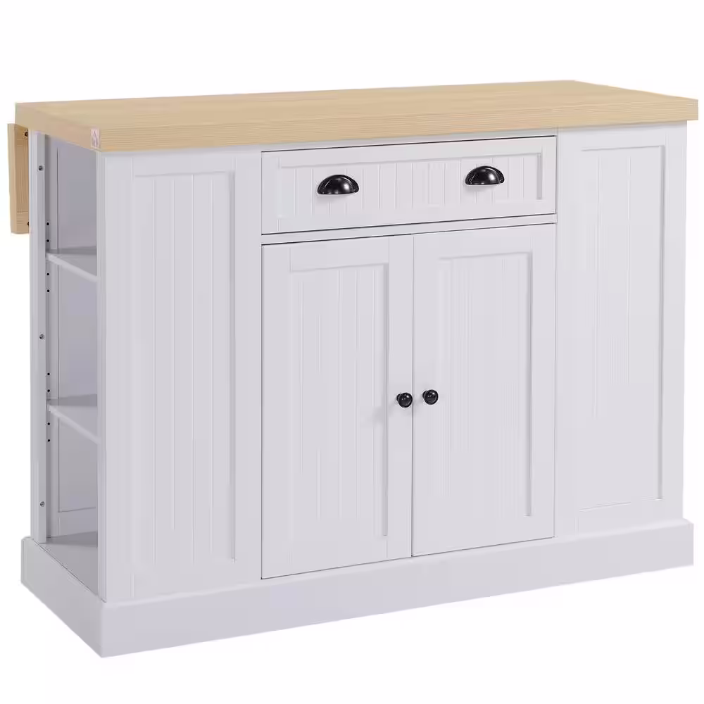 HOMCOM Fluted-Style White Wooden Kitchen Island , Countertop with Drop Leaf, Drawer, Open Shelves, Storage