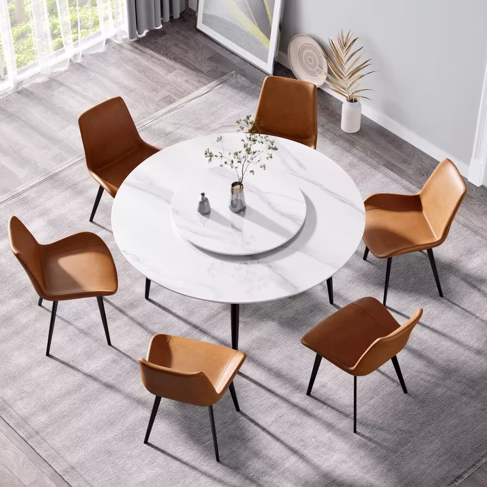 Magic Home 59.05 in. Circular Sintered Stone Tabletop Kitchen Dining Table with Beige PU and Metal Pedestal Base (6 Seats)