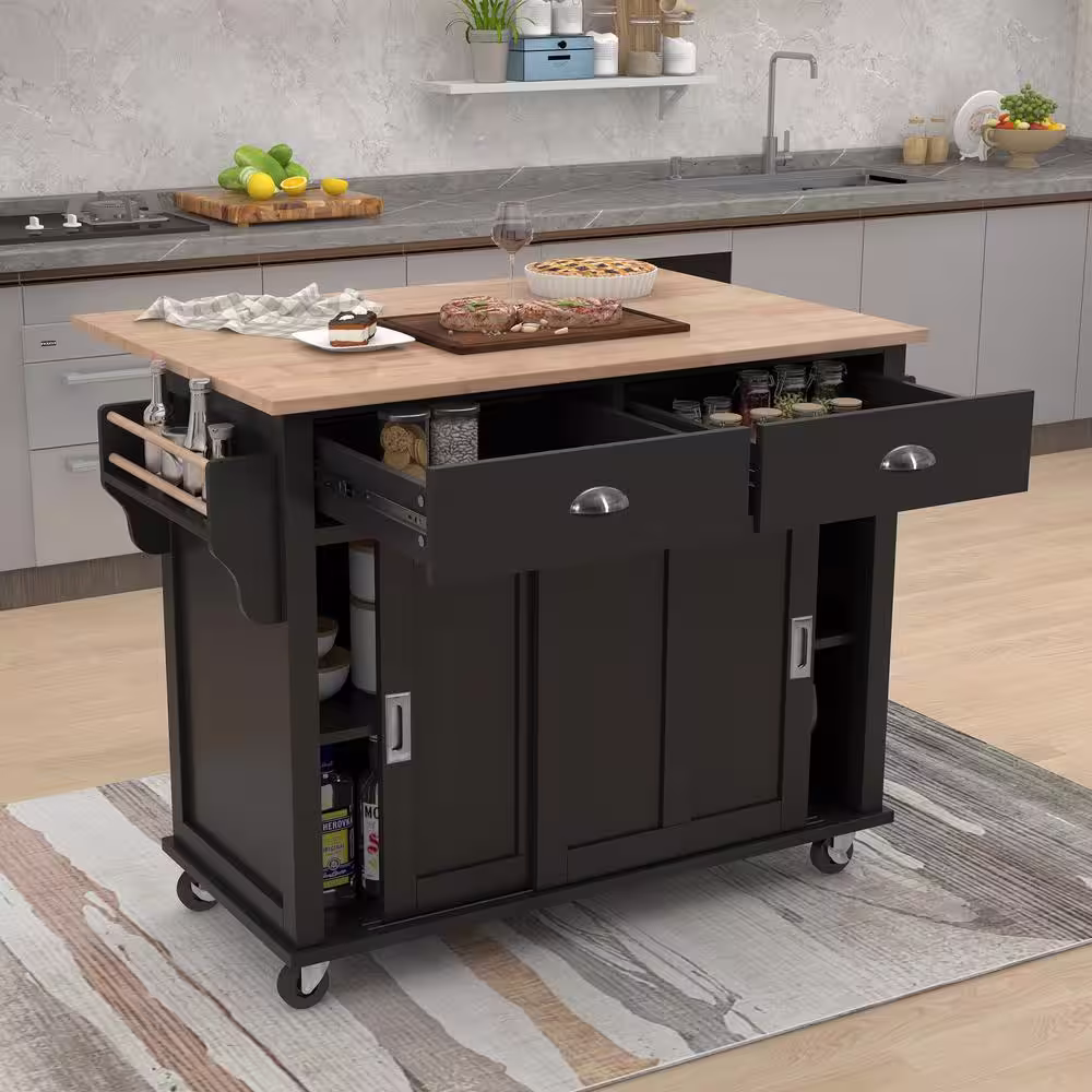 None Black Rubber Wood Flodable Drop-Leaf Countertop 52.2 in. W Kitchen Island with Concealed Sliding Barn Door, Drawers