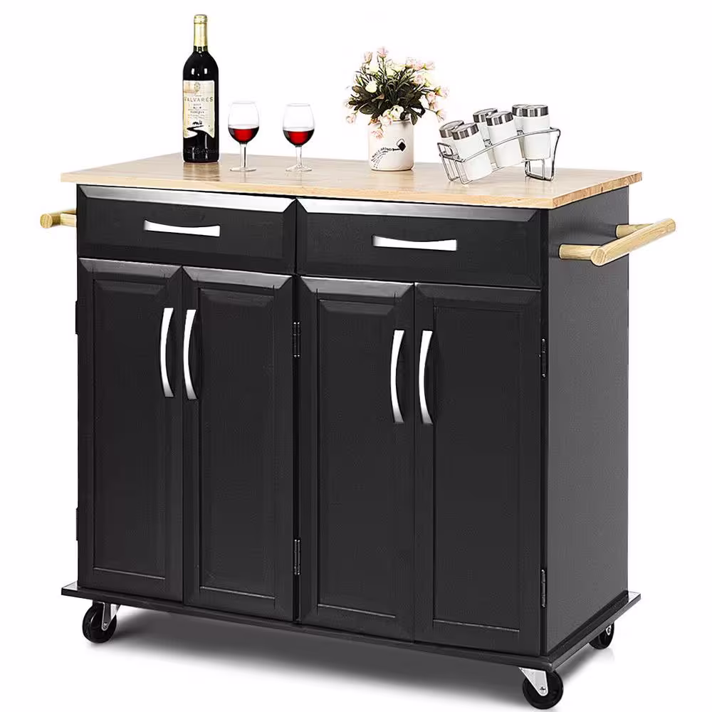 Costway Black Kitchen Cart with Natural Wood Top and Cabinet Storage