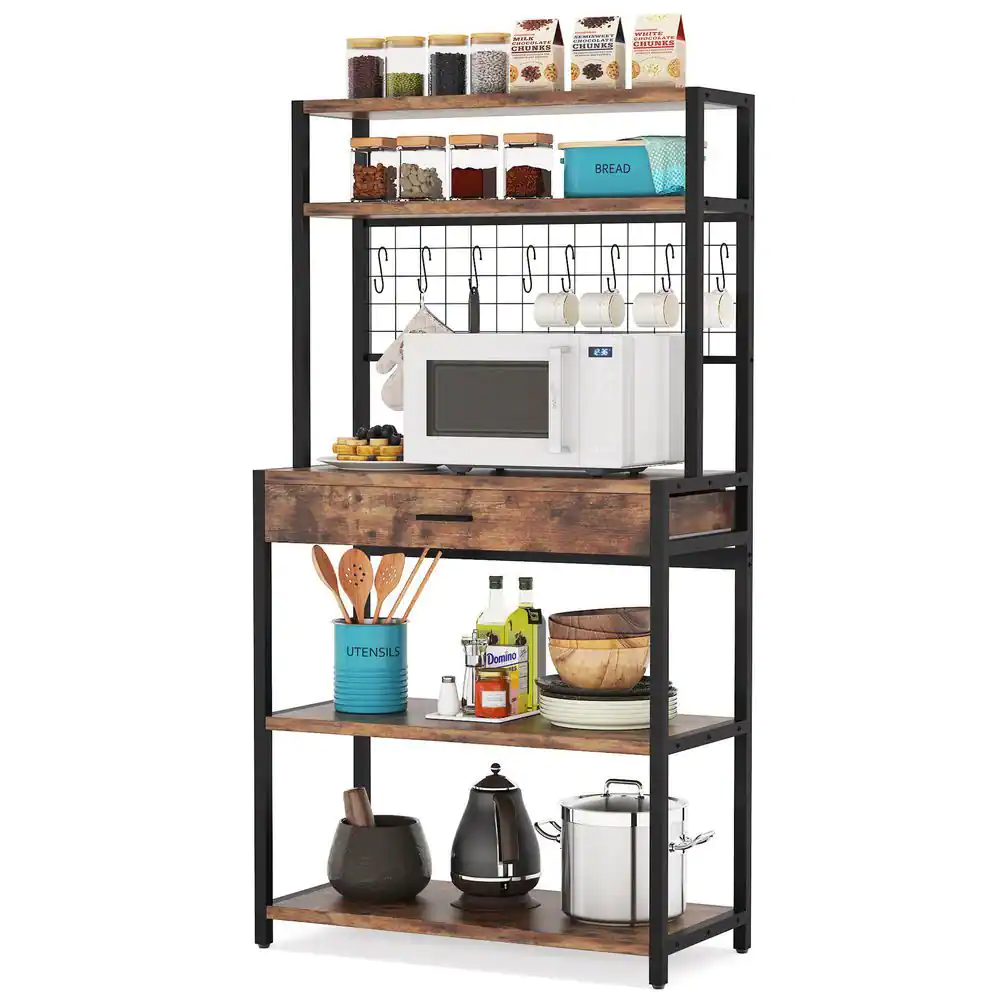 Tribesigns Kathleen 63 in. Vintage Brown Wood Kitchen Baker's Rack, 5-Tier Kitchen Utility Storage Shelf with Drawer and 8 S-Hooks