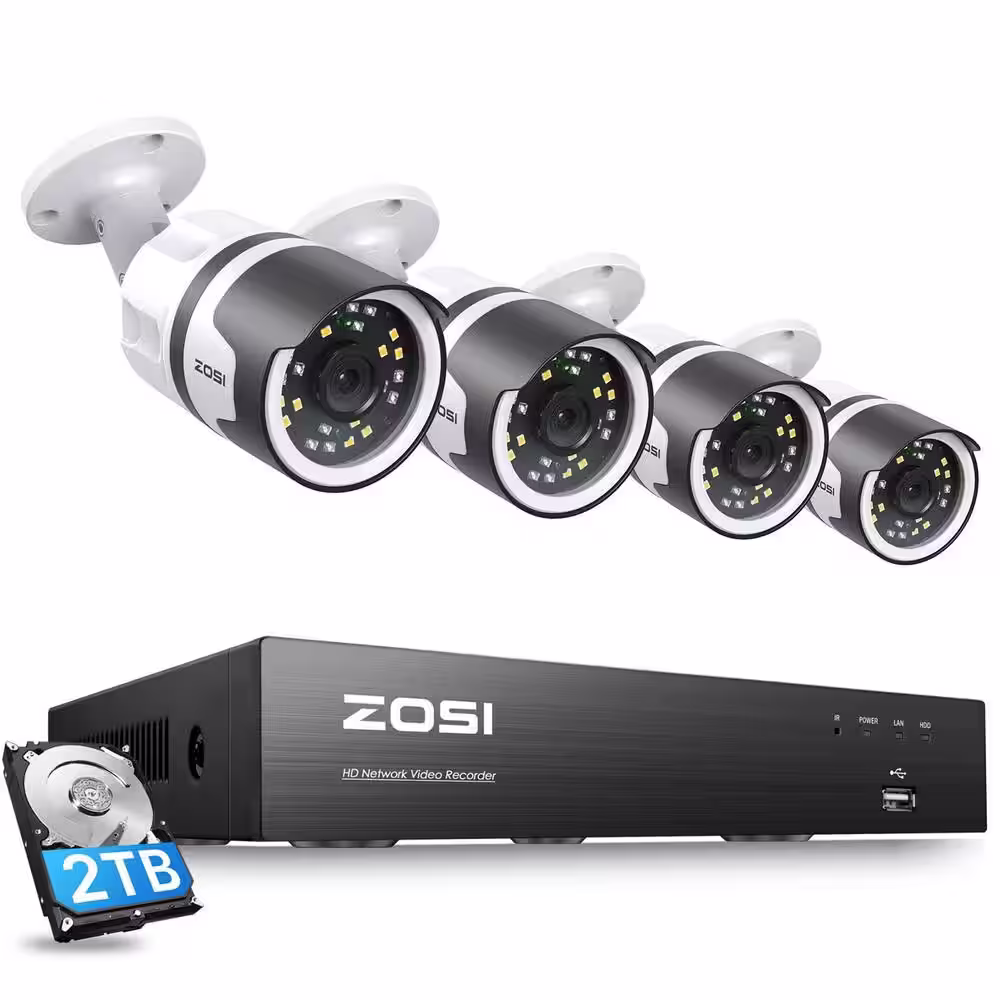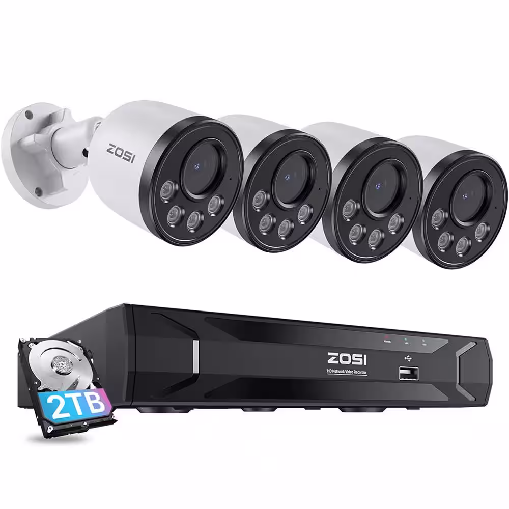 ZOSI 8-Channel 5 MP POE 2TB NVR Surveillance System with 4 Wired 4MP Outdoor Bullet Cameras, Human Detection, Audio Recording
