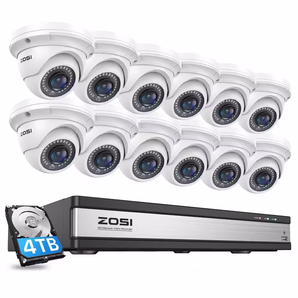 ZOSI 4K UHD 16-Channel POE NVR Security Camera System with 4TB HDD and 12 Wired 5MP Outdoor IP Dome Cameras