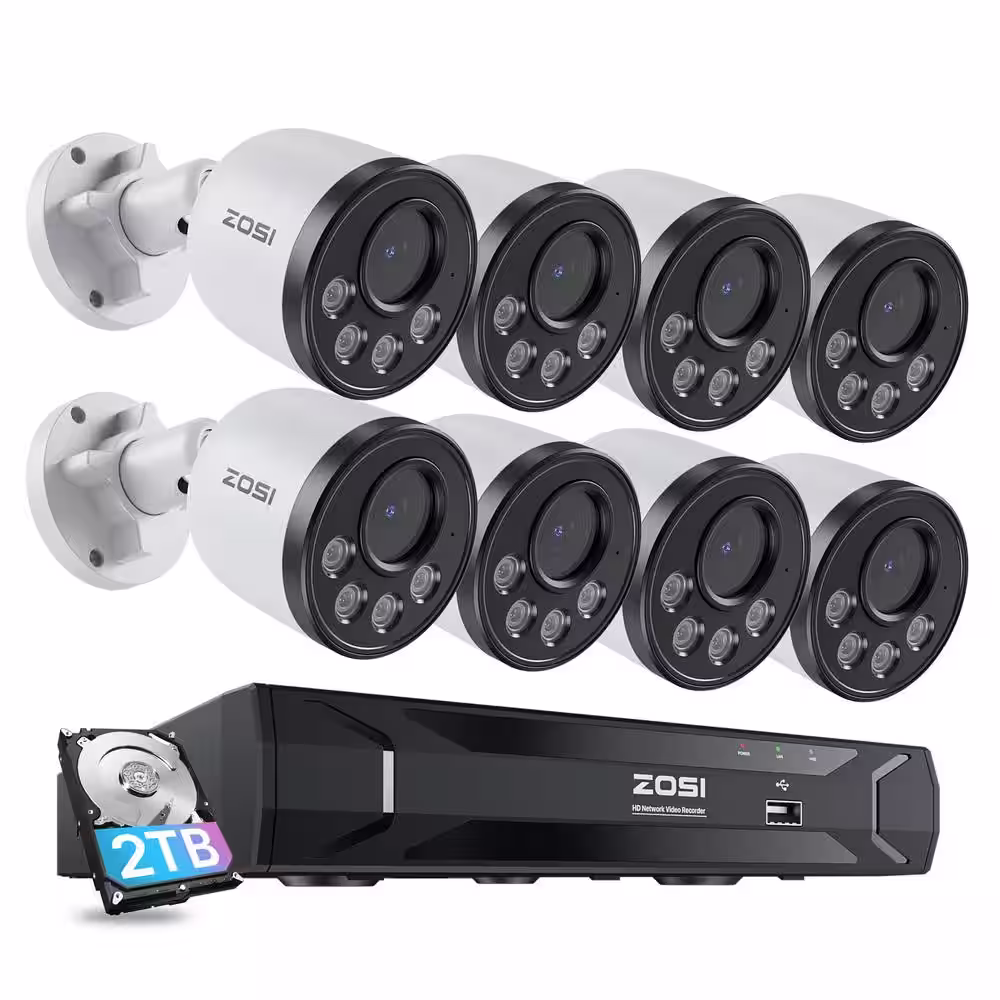 ZOSI 4K 8-Channel 5MP POE 2TB NVR Security Camera System with 8 Wired Outdoor Cameras, Smart Human and Car Detection