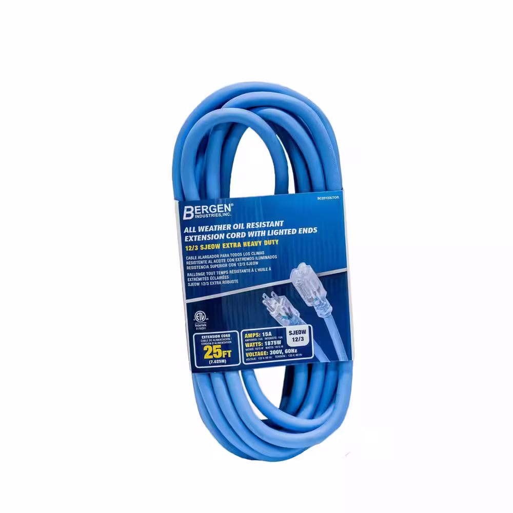 Bergen Industries 25 ft. 12/3 SJEOW 15 AMP Blue Outdoor Heavy-Duty, All Weather Extension Cord with Lighted End