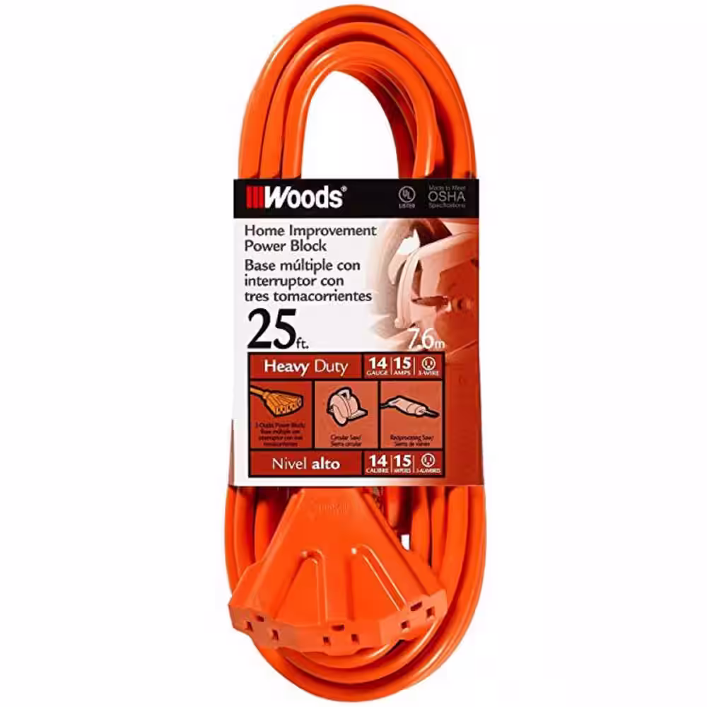 Woods 25 ft. 14/3 SJTW Multi-Outlet (3) Outdoor Heavy-Duty Extension Cord, Orange