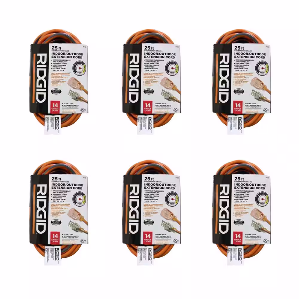 RIDGID 25 ft. 14/3 Heavy-Duty Contractor-Grade Indoor/Outdoor Extension Cord in Orange and Gray (6-Pack)