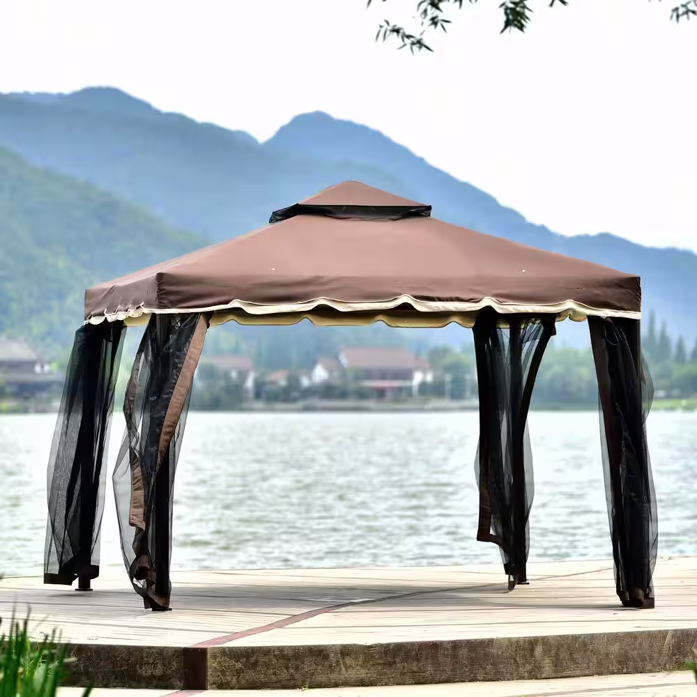 None 9.8 ft. x 9.8 ft. Brown Outdoor Iron Vented Dome Top Patio Gazebo with Netting